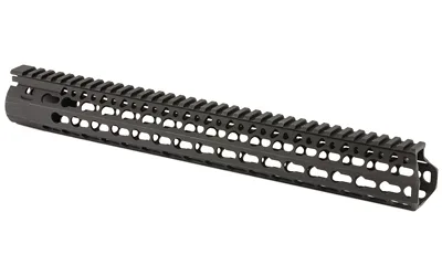 Bravo Company’s BCM KMR ALPHA 15″ KeyMod Free Float Handguard is manufactured from aluminum that is lightweight yet durable. It also features a proprietary patent pending mounting indexing and lock up system that mitigates 12:00 rail movement under heat generated from the barrel nut. Inner diameter is 1.3 inches and the outside is 1.5 inches flat to flat. The handguard flares forward (towards muzzle end) at the 3 and 9 O’clock positions approximately 1/4 inch and the actual length when measured to flare is 10.5 inches. The KeyMod interface system was developed by Eric Kincel (now the Director of BCMs’ product development team) to work in parallel with the current picatinny system. In many applications it will advance modularity past the current 1913 rail system. The BCM KMR Alpha also allows for a larger range of modularity offering 4 different offset mounting positions between traditional 3, 6, 9 and 12:00 positions. In the most basic of applications the KeyMod system allows for universal modularity between various manufacturers of accessories and accessory rails. A big win for the trigger puller.