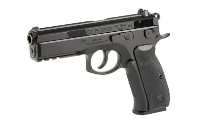 The CZ 75 SP-01 is the first full size handgun (4.6″ bbl) from CZ to feature the improved manufacturing technology and ergonomics of the NATO-approved CZ 75 Compact P-01 model. Featuring an integral 1913 accessory rail on the dust cover, rubber grip panels, and CZ’s corrosion resistant black polycoat finish, the SP-01 is the newest model to join the family of pistols based on the CZ 75 (SA/DA) platform. Borrowing from the improved grip geometry of the compact P-01, the SP-01 utilizes an extended beavertail to protect shooter’s strong hand as well as allowing for a deeper and more secure grip. The new grip geometry, checkering in key areas on the front and back straps, and redistribution of mass provided by the accessory rail noticeably decrease the perceived recoil from previous models and allows for more rapid target acquisition and transition. This model has a manual safety.