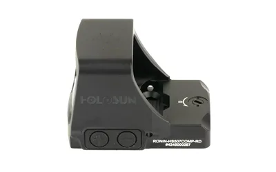 The Ronin 507COMP handgun sight features a large 1.1″ x 0.87″ objective lens for enhanced shooting performance and Holosun’s 32MOA ring with 2MOA dot MRS (Multi-Reticle System) available with a red LED. The Ronin 507COMP is engraved with the Iconic Ronin dragon logo and features stealth black on black markings.