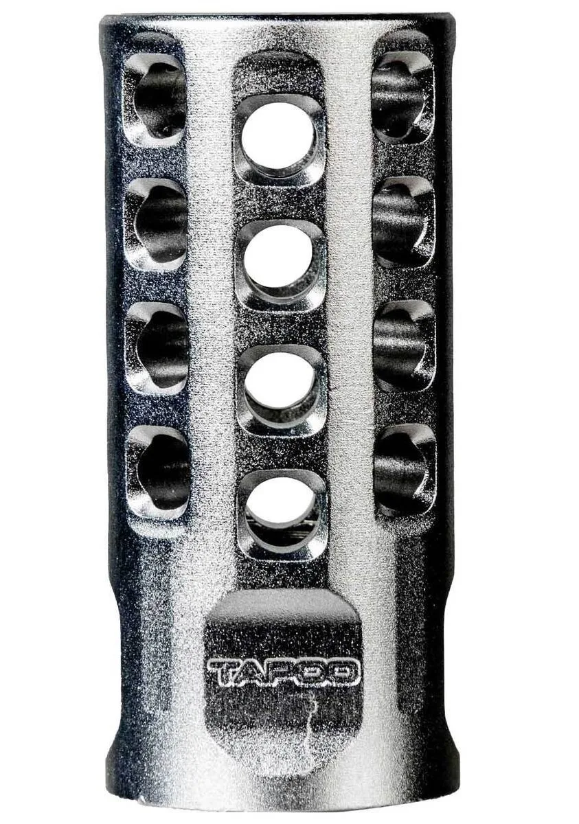 The Barking Spider is designed to redirect noise, blast, and concussion forward and away from the shooter (down range). It also increases the back pressure which in turn can increase the reliability in a short barrel application where dwell time has been sacrificed for barrel length or the increased pressure is needed for sub sonic or weak ammo. The Barking Spider can be used on any barrel length but it really shines in short barrel applications. The Barking Spider is Modular in that it can accept multiple different end caps, attachments, and thread protectors. The Modularity allows the operator to tailor the weapon system for a specific application. The front end of the Barking Spider has an integrated striking device or glass breaker with 1 1/8″ wrench slots for easy disassembly making cleaning and maintenance a breeze. The internals come out the front leaving the body attached to the barrel. This allows you to pin (perm attach) the body to the barrel to meet 16″ OAL requirements yet still be able to disassemble the muzzle device from the front. The Barking Spider was specifically designed to handle full auto and high volume fire. The Barking Spider features a cutting edge blast cone design which is supported in both the front AND the rear. This feature not found on any other Krinkov muzzle brake eliminates the cone from sagging in extremely high temperatures. The Barking Spider, patent pending, is 100% Made in the USA and features a Lifetime Warranty!